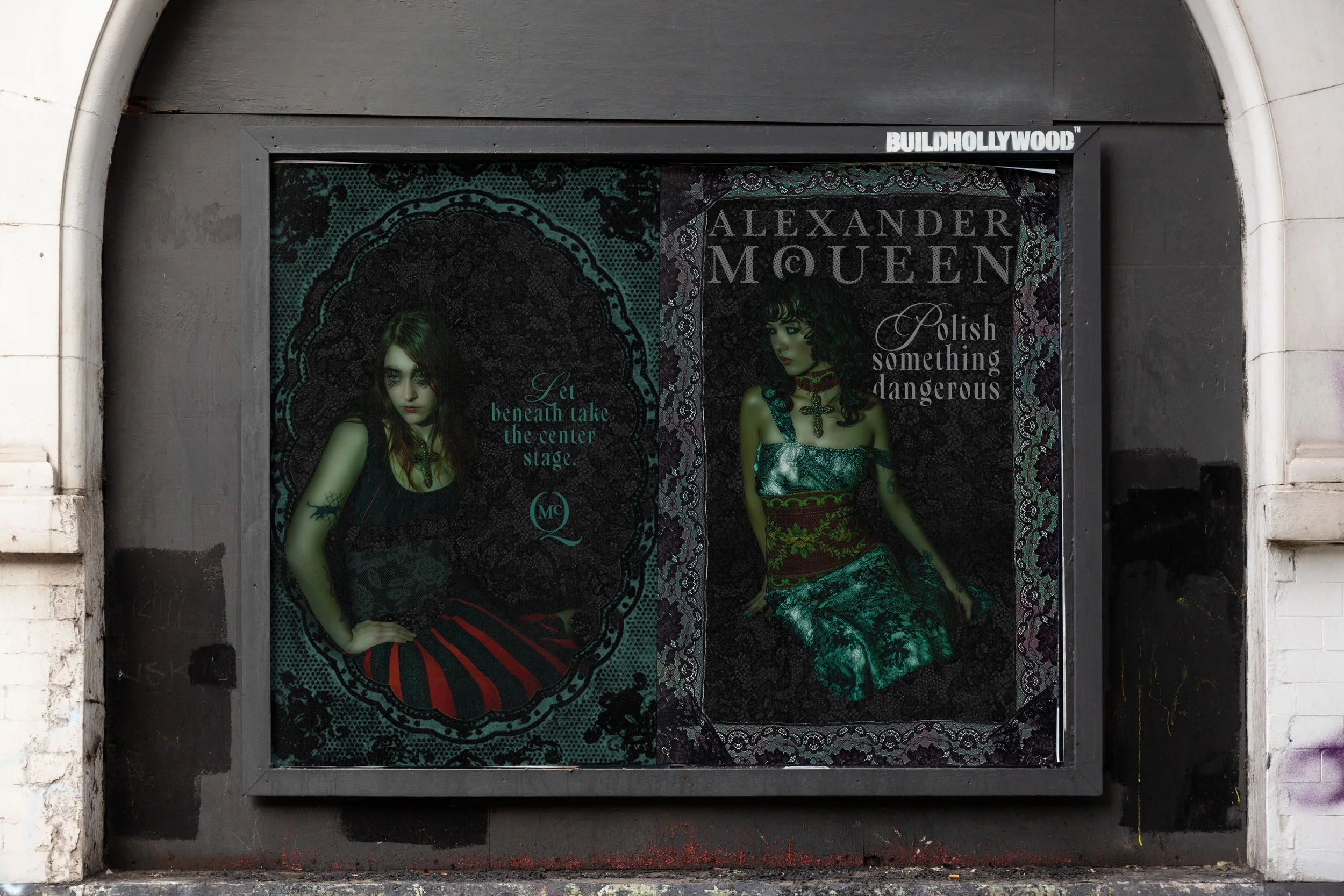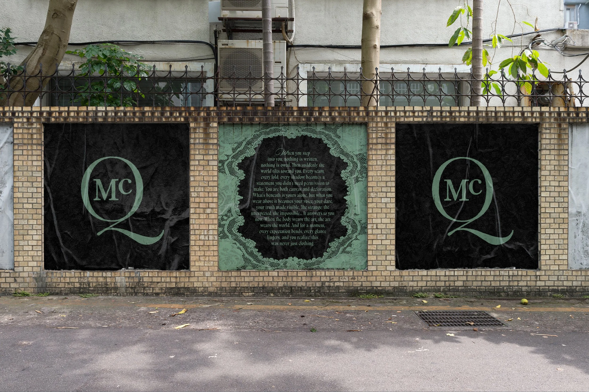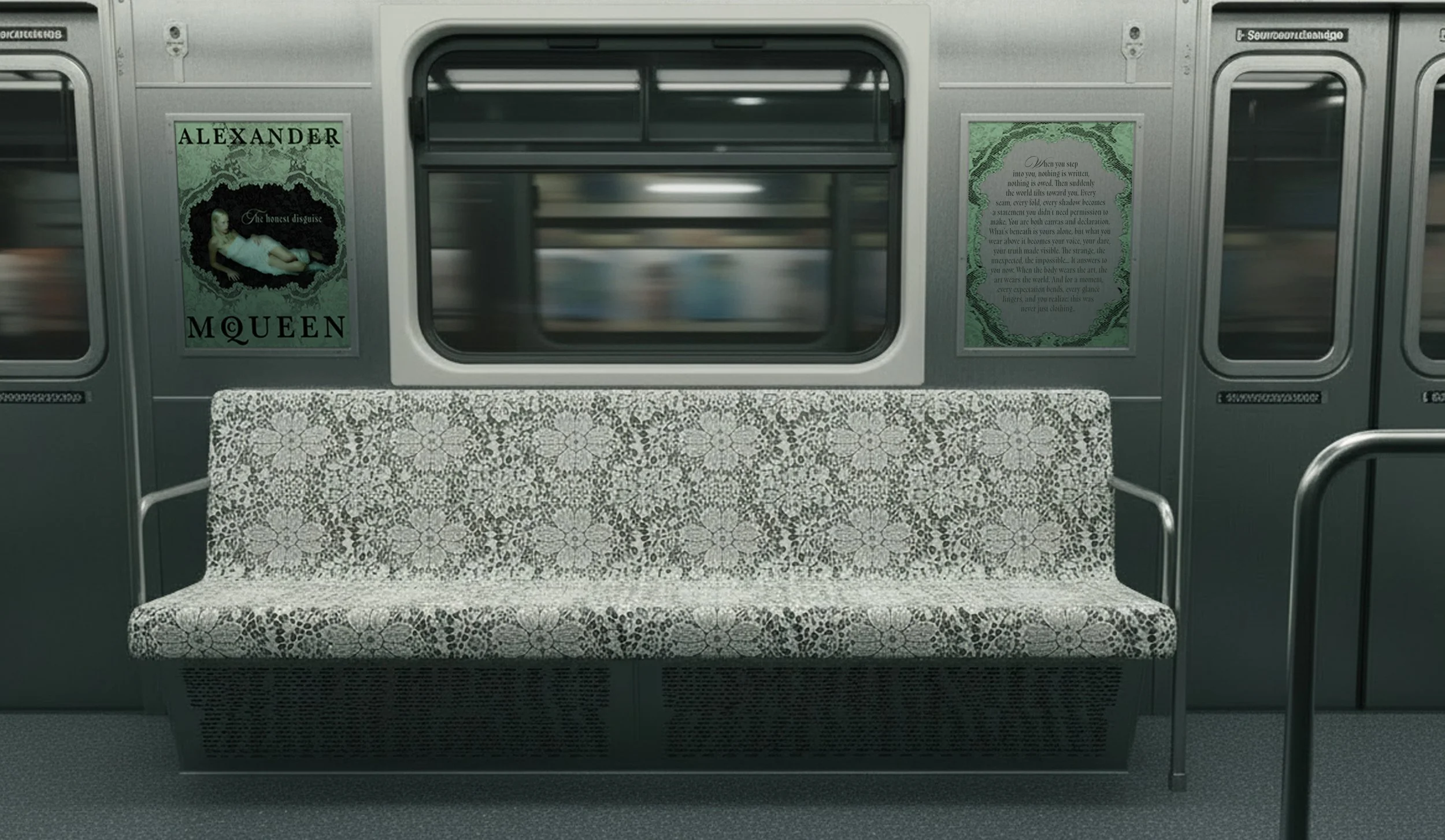The subway car becomes a moving manifesto. Black lace commands outside, white lace glows inside, and lines like “Every fold holds a story” remind passengers that what is covered holds its own power.