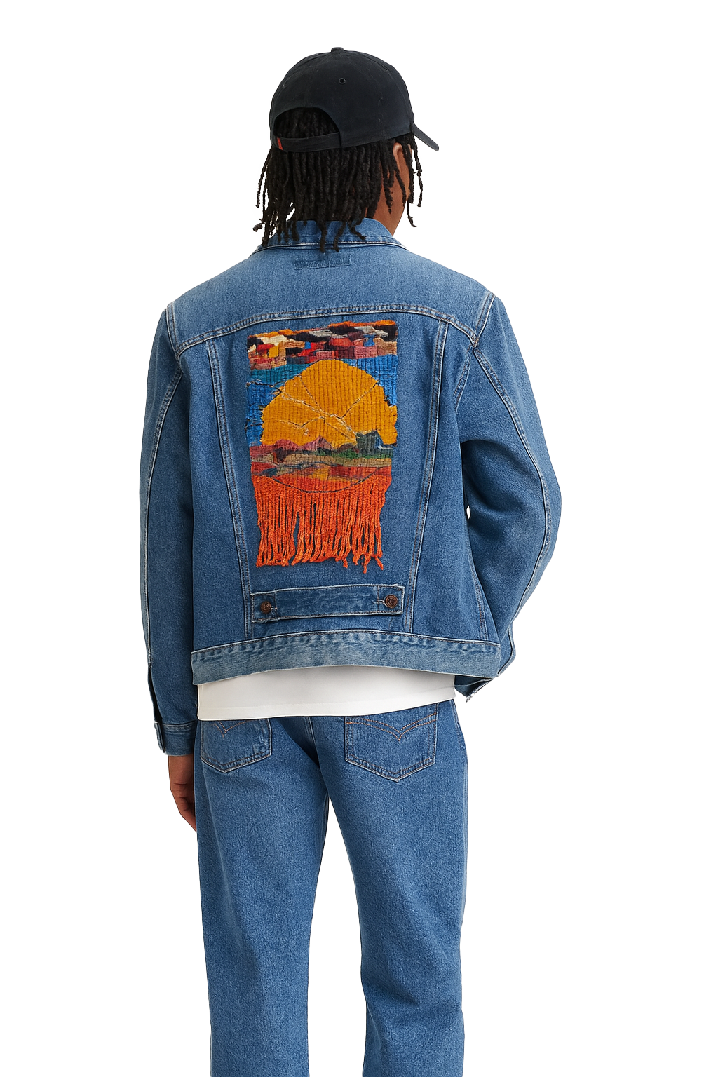 A limited edition 501 with a custom red patch and a patchwork jacket designed by immigrant artists. Built to honor the work and creativity that keep America moving.
