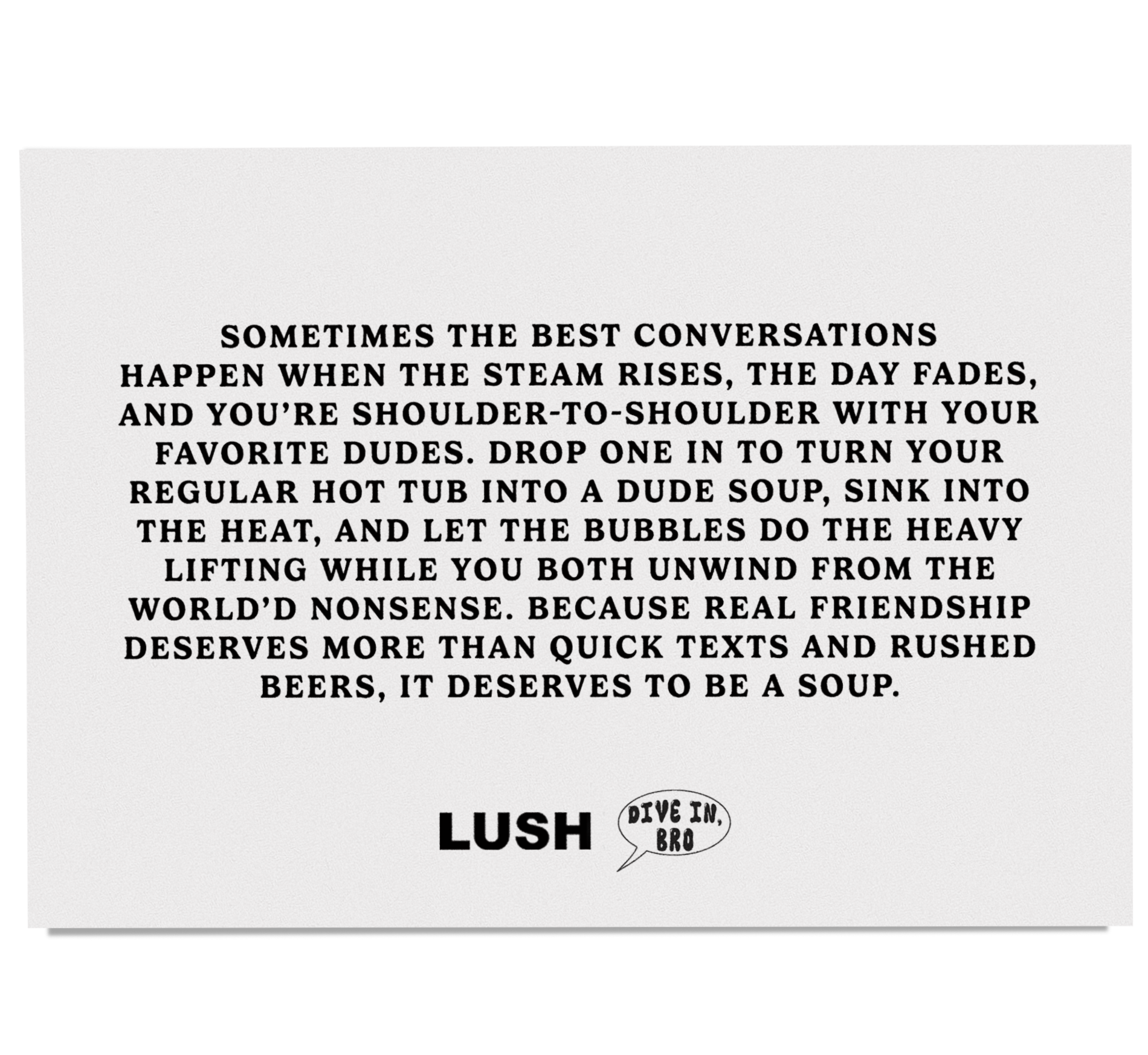Hot water, familiar smells, and hot takes. Meet Dude Soup from Lush: the only hot tub–safe bath bombs for the ultimate male bonding experience.