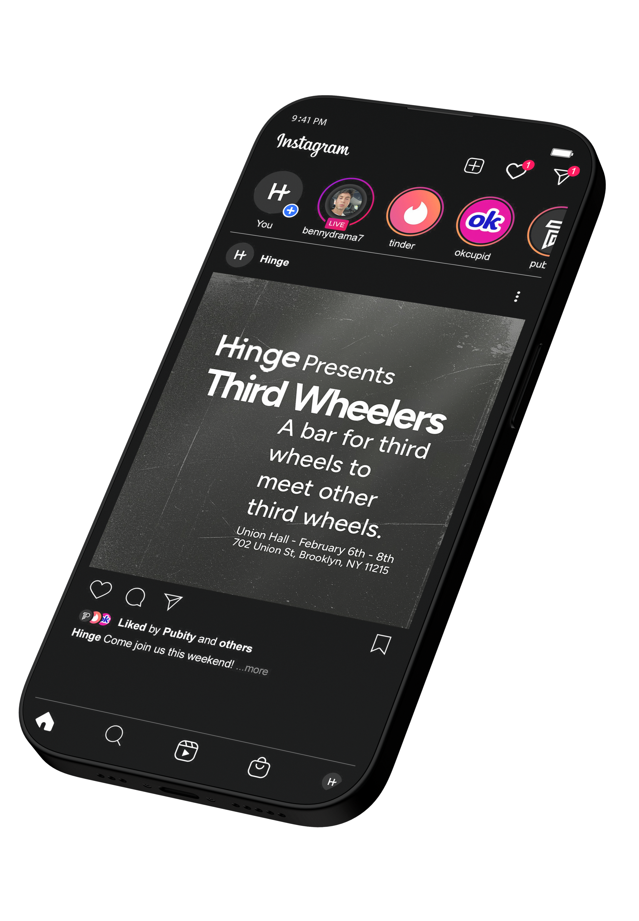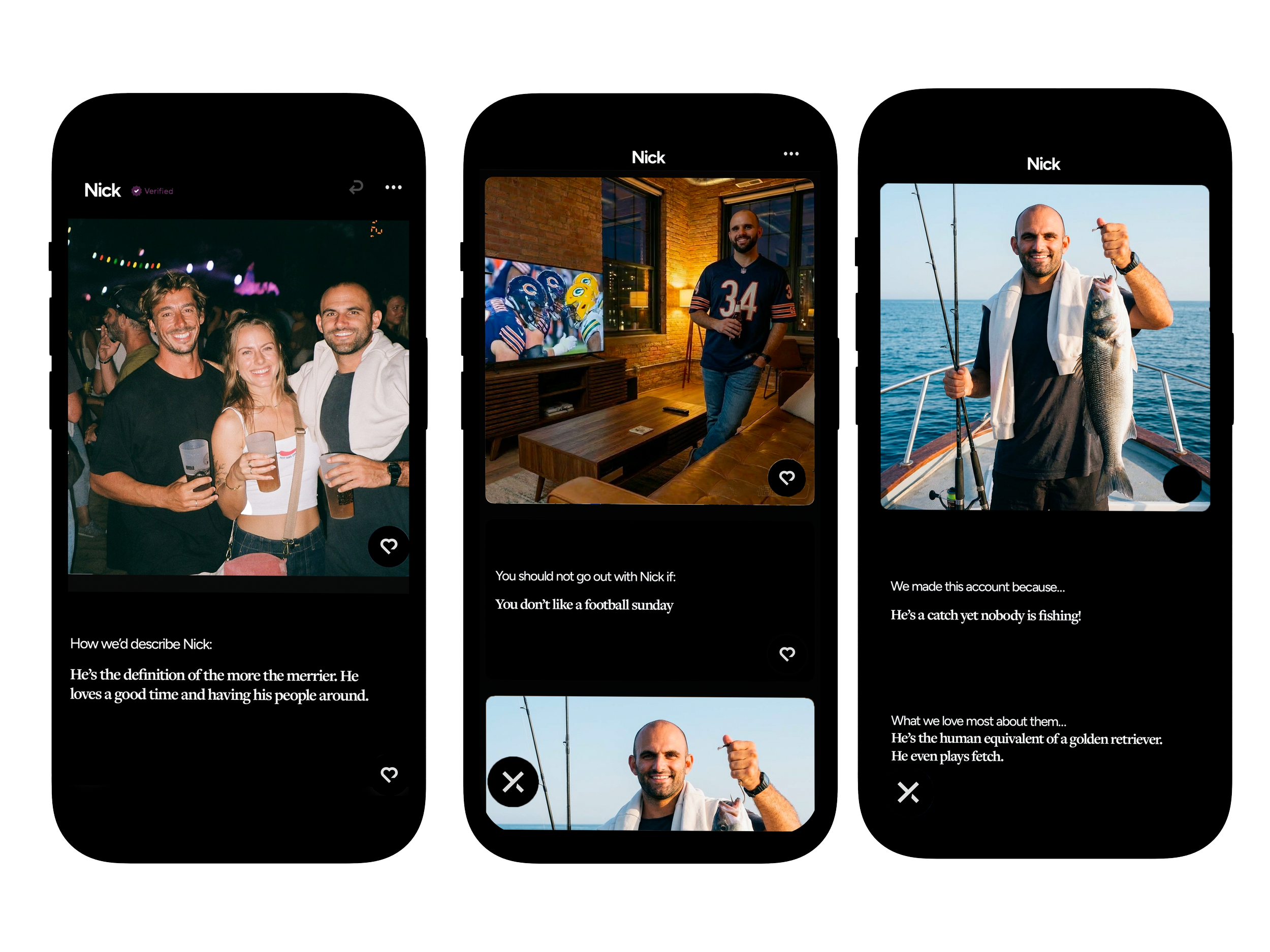 Couples use the app to create and run a dating profile for their single friend: photos, prompts, the whole thing. That profile is only shown to other third-wheel profiles, so matches always come from people in the same situation.